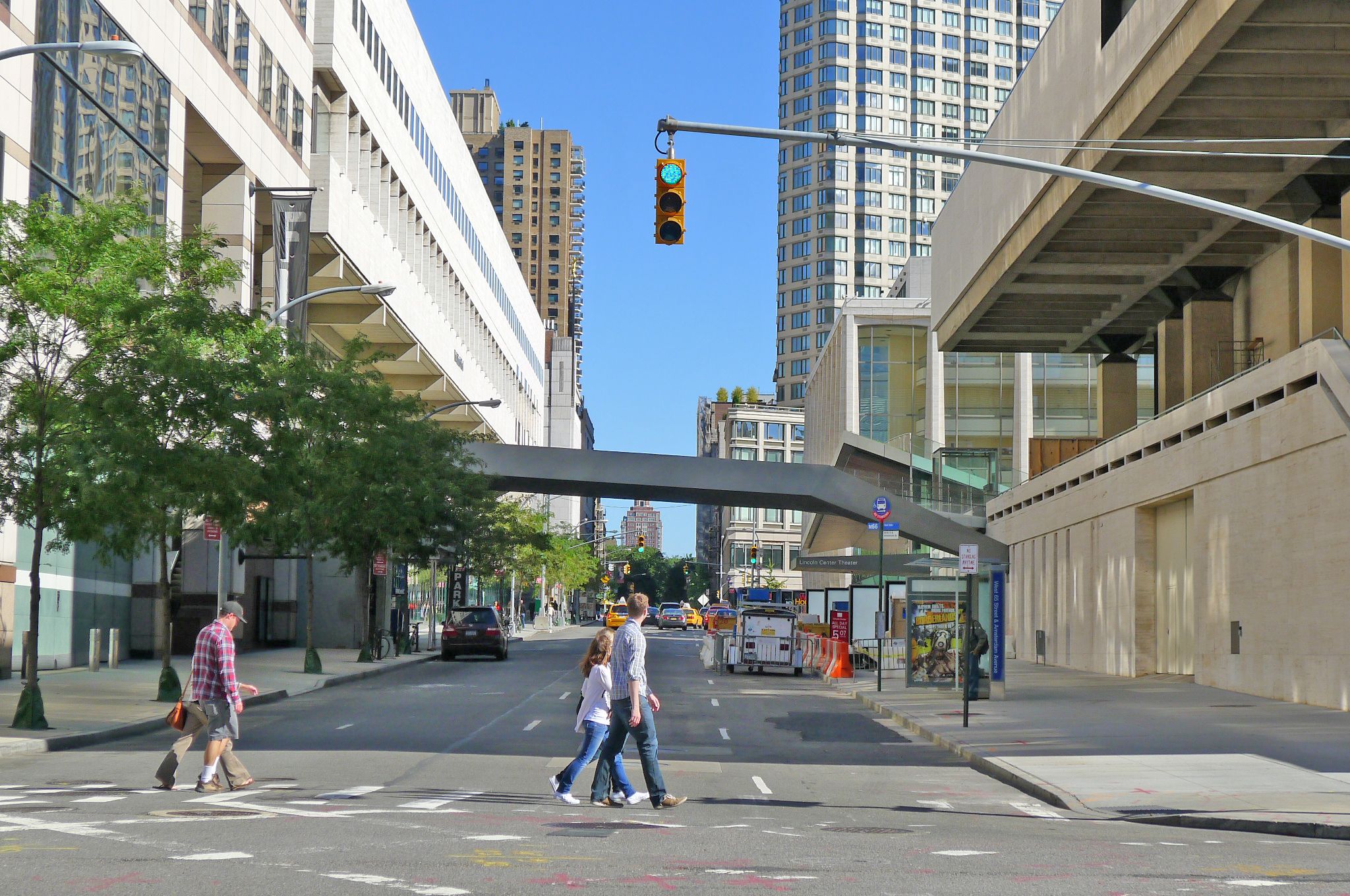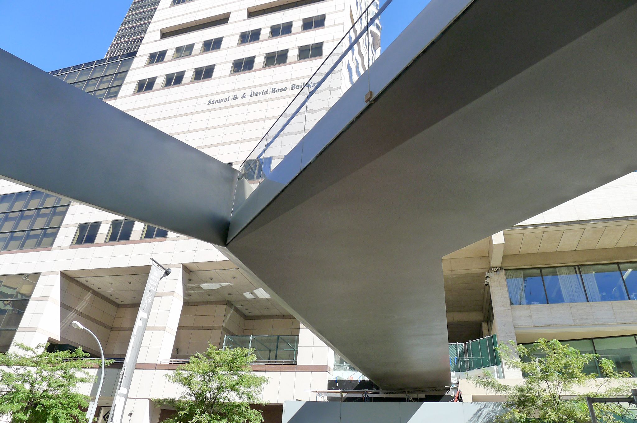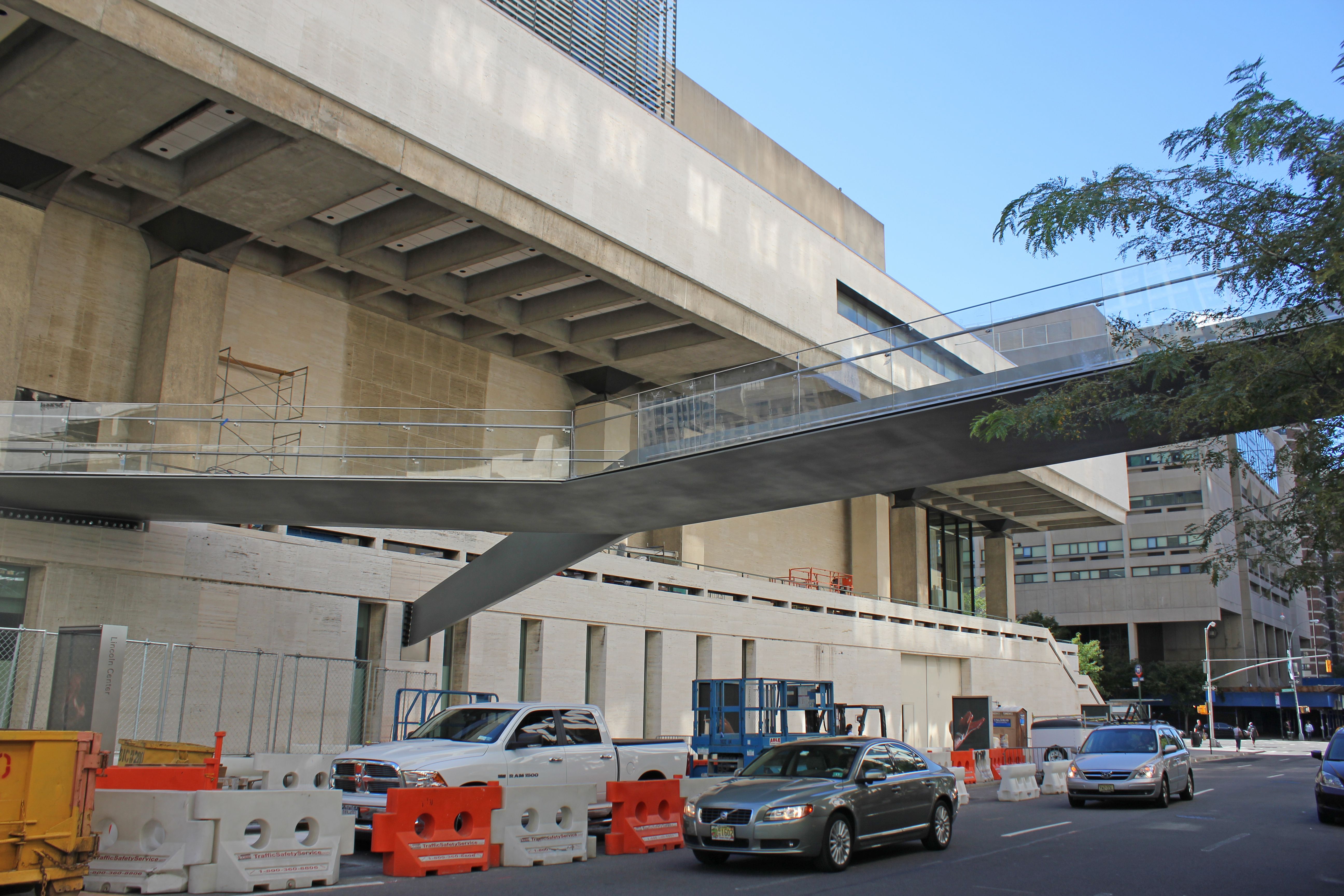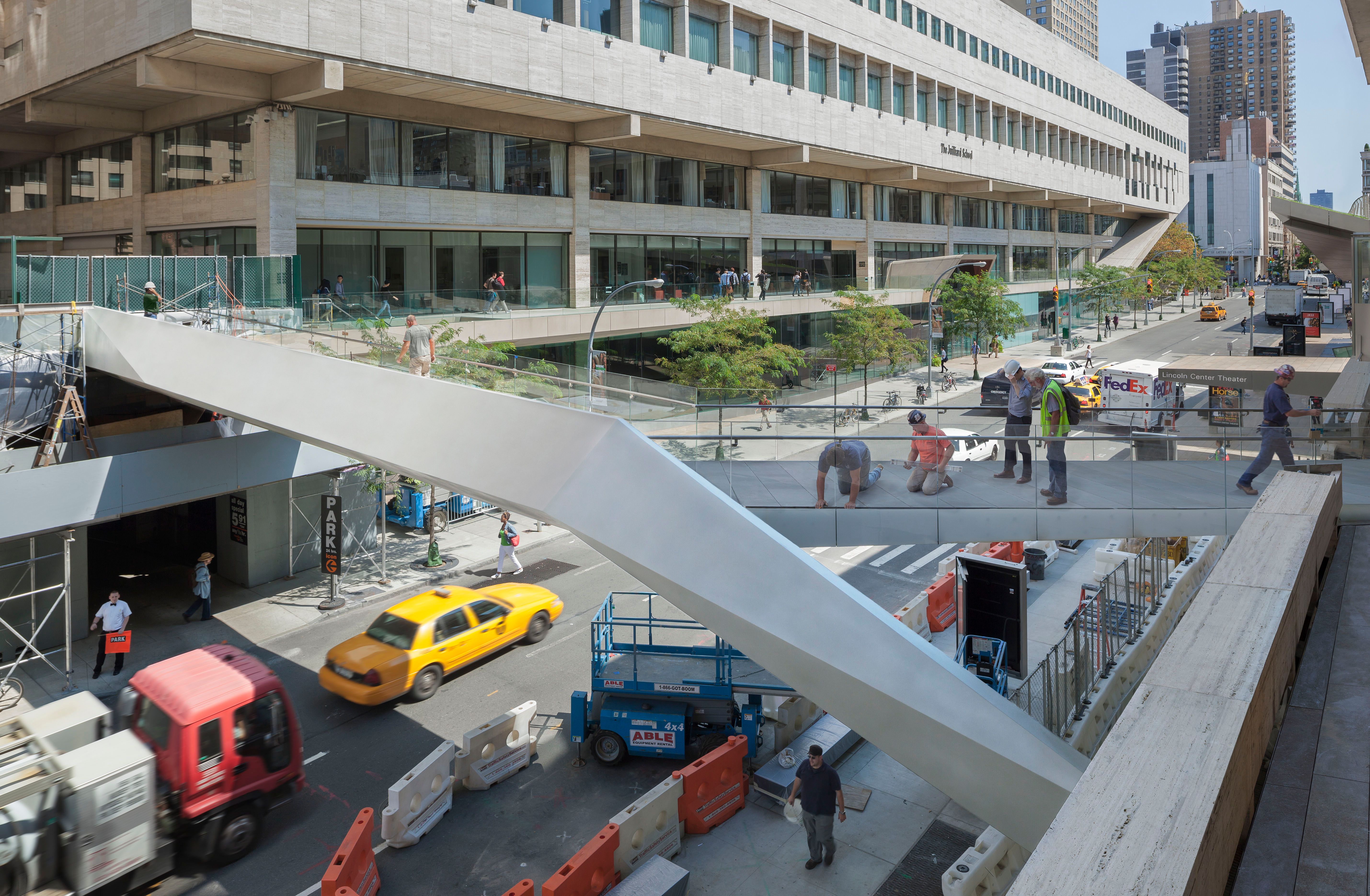 The Lincoln Center Pedestrian Bridge (The President’s Bridge) is the final element of the Lincoln Center campus–wide transformation. Spanning West 65th Street near Amsterdam Avenue, the bridge provides an alternative to street–level crossing for visitors, artists, students, neighbors, and staff members. Emerging from simplicity of a truss bridge, the bridge keeps its structural and circulation functions separate. While the bearing beam spans the most direct route across the street, the walking surface deviates to the east, directing the flow of foot traffic into the sweet spot of North Plaza, between Lincoln Center Theater and the new Hypar Pavilion. The bridge minimal in nature: structure and cladding are one. The stressed–skin construction is composed of an asymmetrical, closed–cell box girder made up of fully welded steel plates varying from a half inch to one inch in thickness. The upturned cross section is created by a deep beam that doubles as the western guardrail. The L–shaped profile tapers to a knife–edge toward the east, while its outer surface is faceted to reduce mass. The bridge’s stressed–skin steel structure is 83’ long and weighs 58 tons.