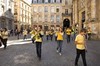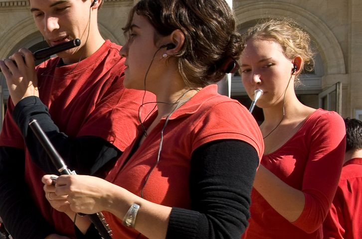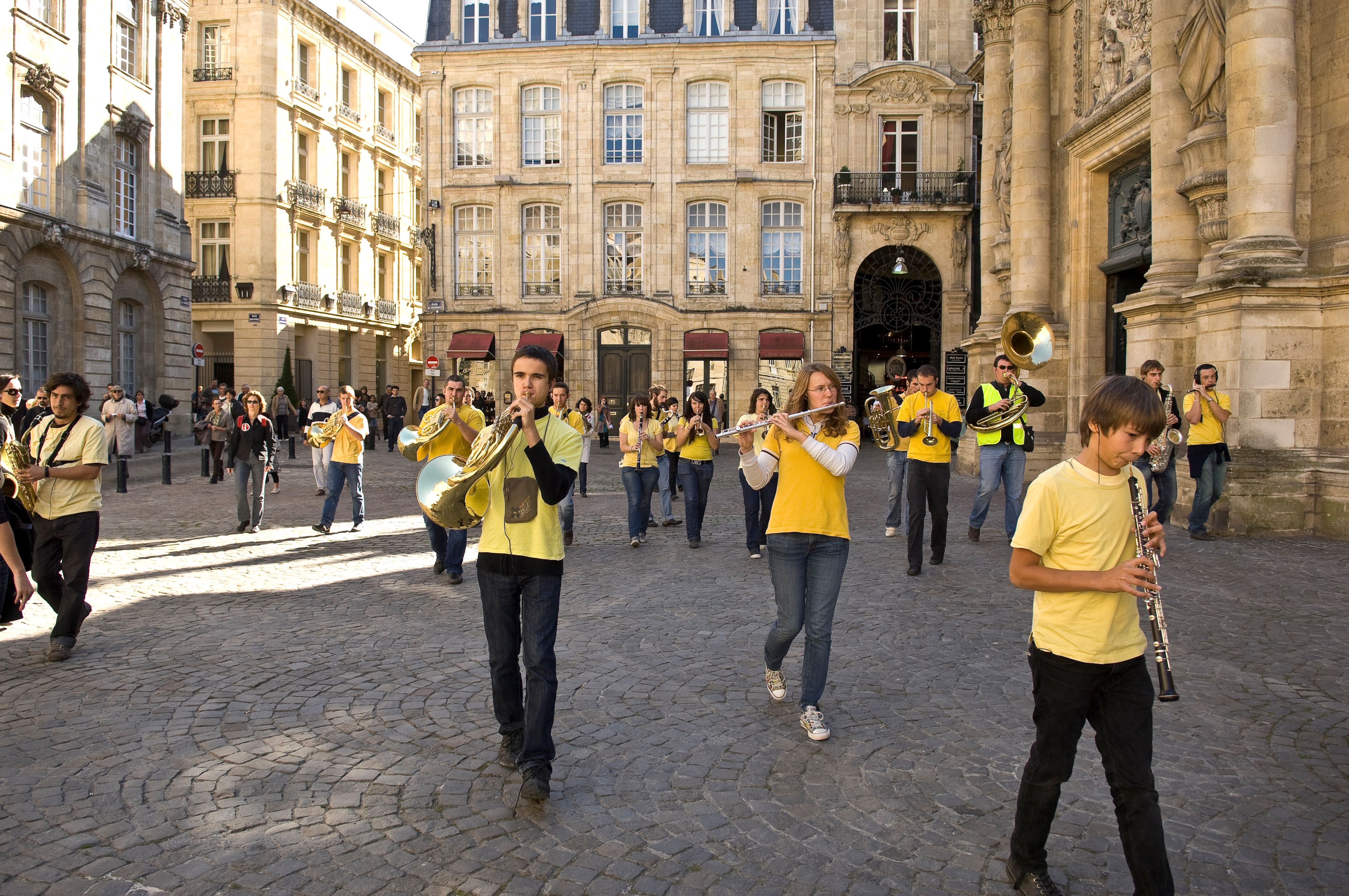 Performers included a guerrilla-style street band of winds, brass, and percussion that rode through town on pedicabs; one hundred musicians from Bordeaux who played an array of horns, trumpets, and trombones, providing a musical accent in specific locations; and two hundred schoolchildren with bicycle bells. Another part of the piece, an ambient track of music, was broadcast over radio. At certain times, listeners throughout Bordeaux were invited to hold their radios out their windows to become part of the urban orchestra: the soundtrack echoed throughout the city.